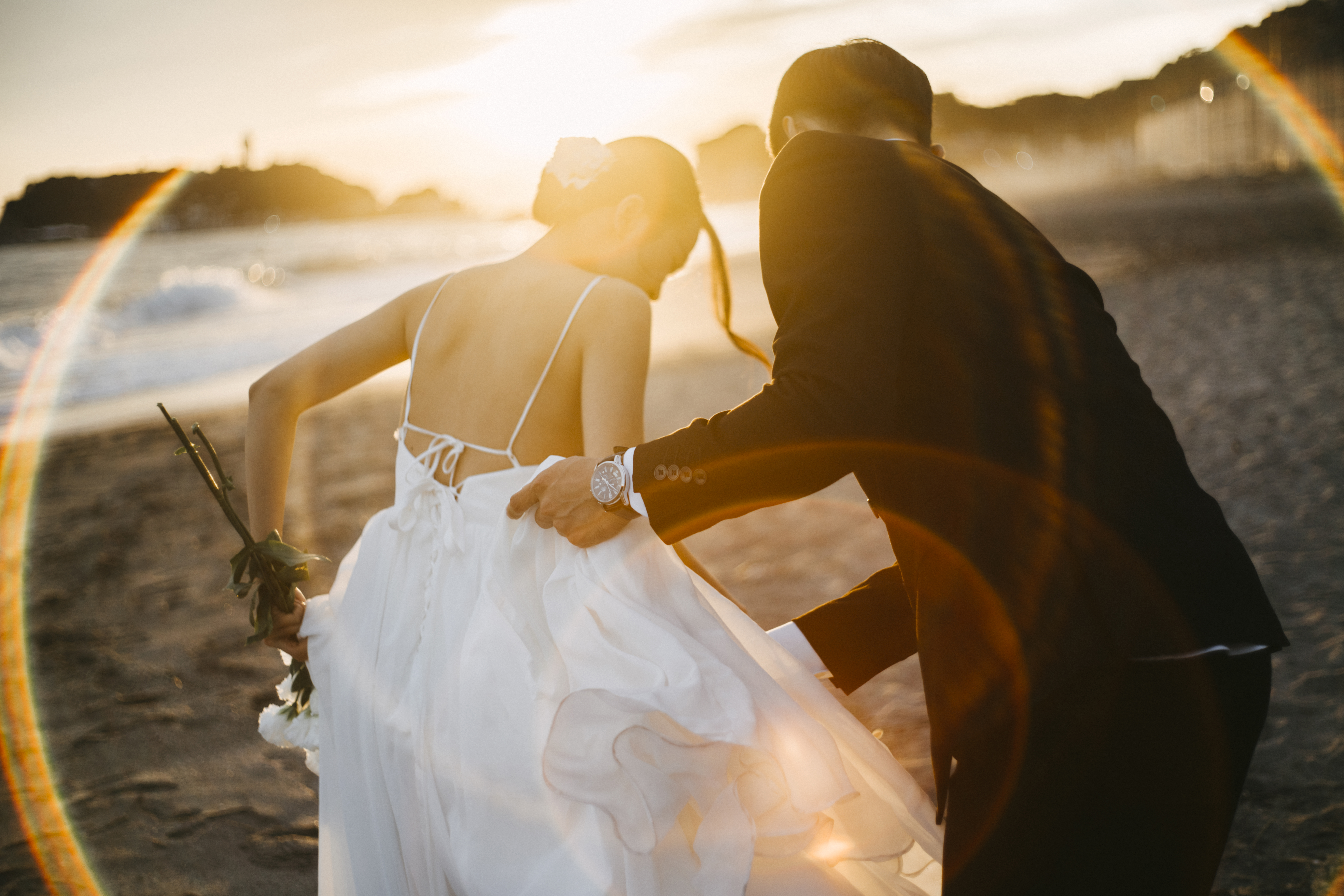 Suit chú rể được phối hài hòa với concept chụp, giúp tổng thể bộ ảnh trở nên cân đối khi đứng cạnh váy cưới hoặc kimono của cô dâu.