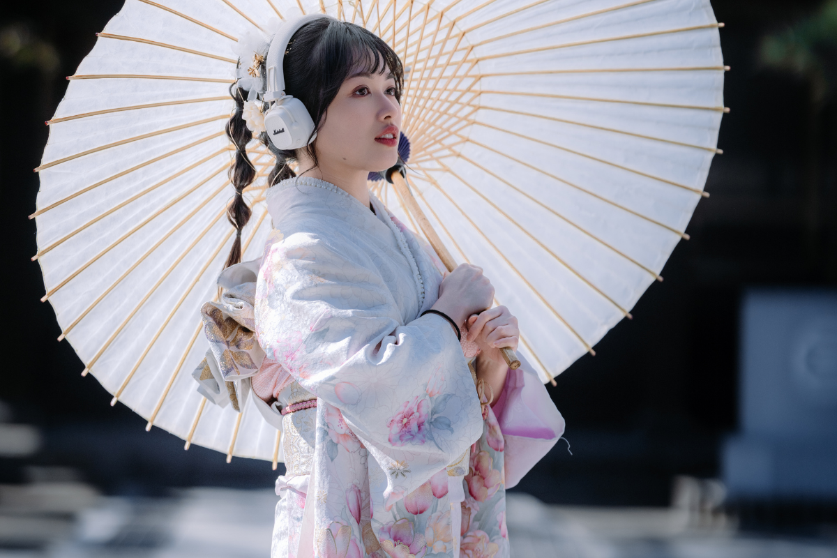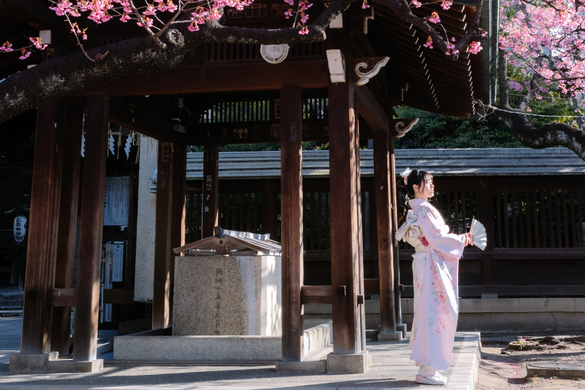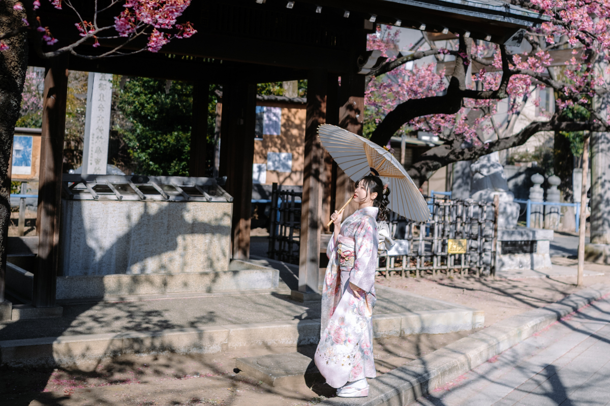 Tháng 2 rất phù hợp với trang phục kimono. Sự kết hợp giữa không khí giao mùa và trang phục truyền thống tạo nên khung hình trang trọng nhưng không nặng nề.